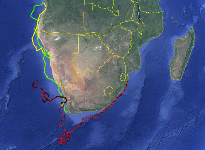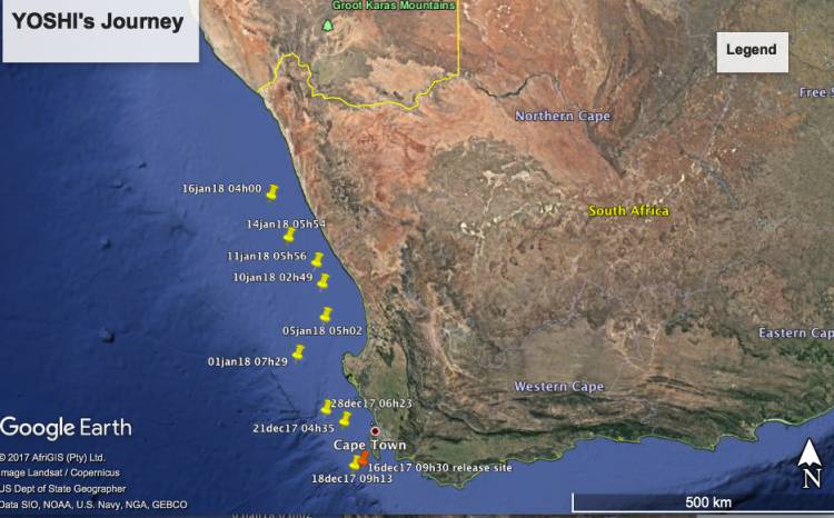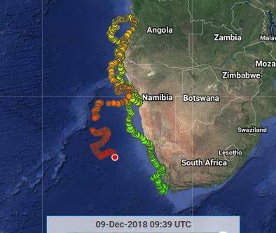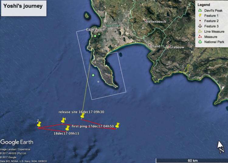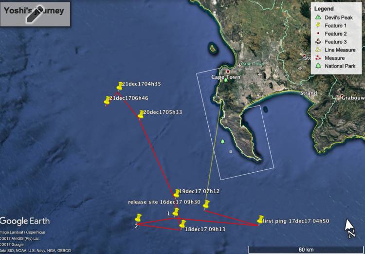 - At 04:50 on 17 December we received our first location transmission. Yoshi had moved 30km to the east, and was south of Cape Point.
