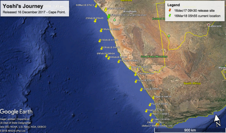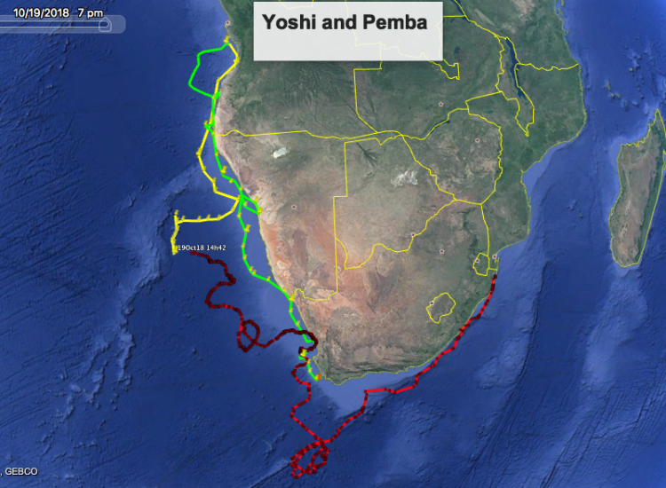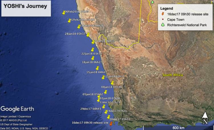 - Yoshi was released a month ago and is well on her way to Namibian waters.