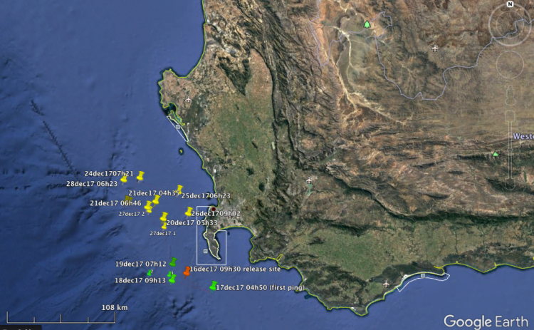 - She is currently in nice 19.6°C water, about 88km south west of Saldanha and about 94km north west of Cape Town. This is also 109km-long straight line from her release site.