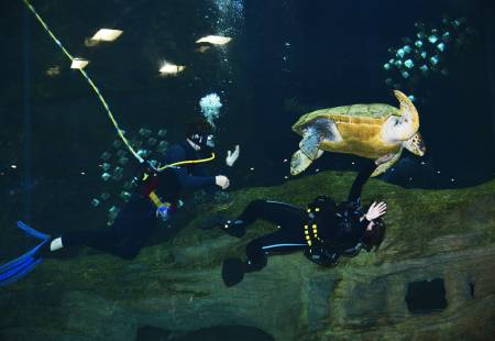 Yoshi the loggerhead turtle arrived in Cape Town in July 1997 on a Japanese fishing vessel as a small 2-kilogram juvenile with a very distinctive injury on the side of her shell. The captain of the fishing vessel had named her Yoshitaro, after the cook onboard who was rather small in stature himself. He contacted the Two Oceans Aquarium and asked for help. We fell in love with this little turtle with an enormous personality. She settled in really well and fast became a big attraction at the Aquarium.