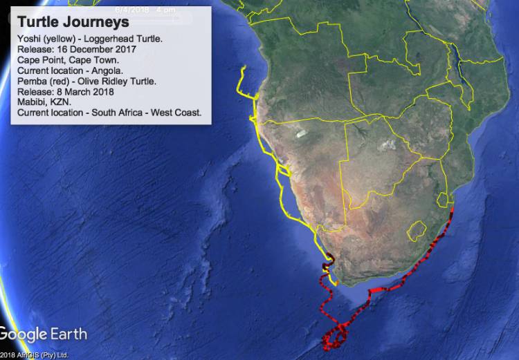 Pemba the olive ridley turtle, a former resident of both the Two Oceans Aquarium and uShaka that was released in March, is currently heading north past Namibia and we expect her path to cross Yoshi's in the next two weeks or so.