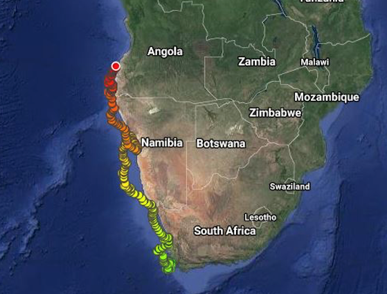 What an interesting few weeks since the last update! Yoshi is enjoying some ‘coastal living’ on the Namibian Coast – and we think that she is most likely having a jelly-feast. The Namibian coastline has seen various algal blooms contributing to large concentrations of jellies and fish, and even some orcas have been spotted in the Walvis Bay area last week. Yoshi is certainly stocking up while food is abundant, before the next leg of her epic journey!