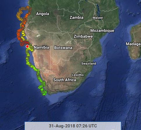 - She is currently about 65km west of Hondeklipbaai, in 18°C water. She travelled just over 36km over the last 24 hours, and is thus making good progress.
