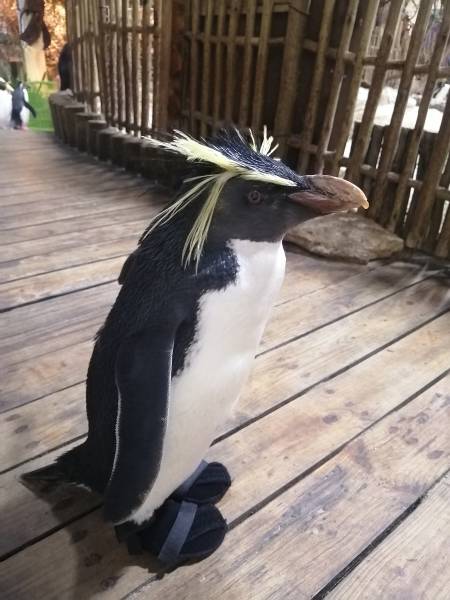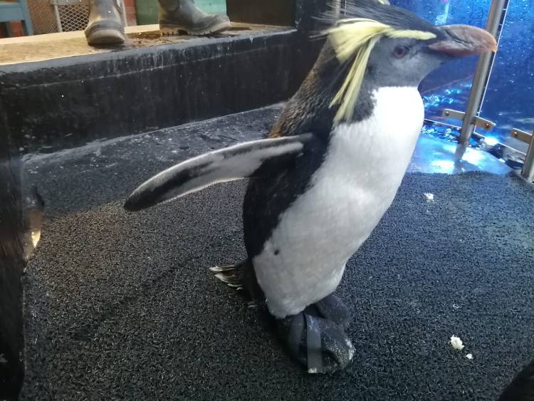 Bumblefoot is a particularly nasty foot infection that birds of all sorts can be affected by, and penguins with their broad, flat, moist feet are particularly susceptible. Although good husbandry practices, like regularly washing and changing the sand and rocks on the penguins' habitat significantly reduces the risk, older penguins like Teddy the rockhopper (who is almost 30) require extra care.