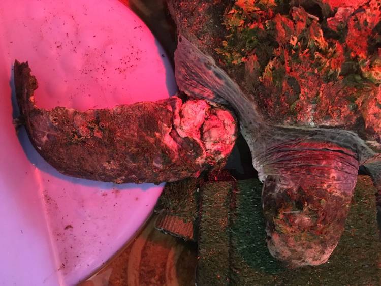 An additional concern is that the turtle's digestive system might not be functioning properly - blockages are common due to plastic litter ingested at sea and the scar tissue it forms. Due to the fact that turtles have slow systems, it will be a while longer before we know with certainty what condition he is in, but we are in the process of trying to feed him and are remaining optimistic.
