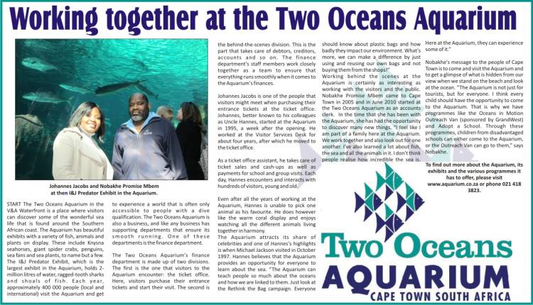The campaign included articles in City Vision newspaper, bi-weekly slots on Radio Zibonele and an amazing day promoting the Aquarium at the Khayelitsha Mall. Staff from the curatorial, education, finance and visitor services departments, as well as from Shoreline Café, featured in articles in City Vision.