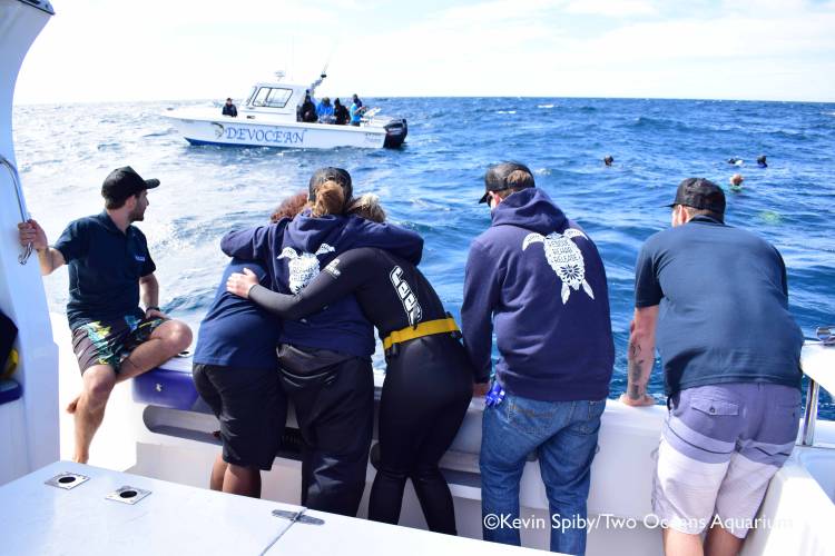 The release of Yoshi today was a monumental event in the lives of our passionate and dedicated turtle rehab team. Safe to say all our staff members have grown extremely attached to this icon of the Aquarium. There were few words and many tears on the boats as this humungous beauty made her first splash in 20 years into the wild waters of South Africa. Yoshi disappeared and swam off the moment she hit the water.