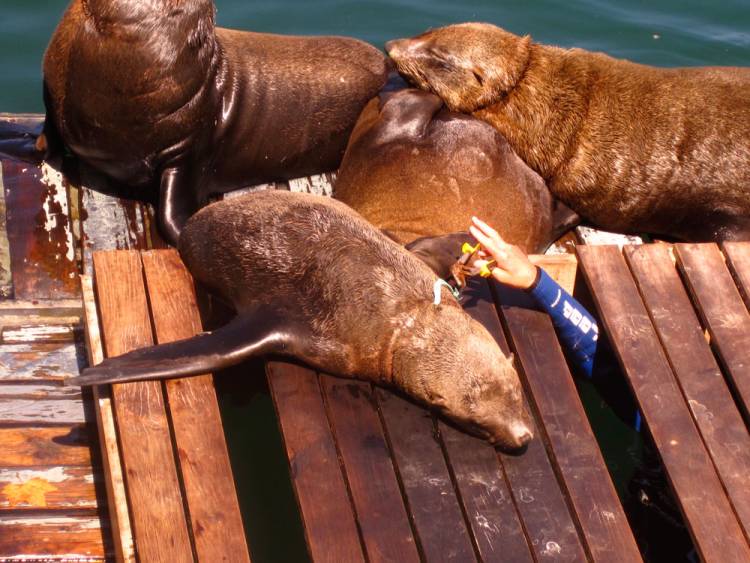 We work with the Marine Wildlife Management Programme in an ongoing effort to disentangle Cape fur seals in the Cape Town harbour. Many seals become ensnared in nooses of discarded fishing lines, bait box bands, raffia cord and other plastic pollution. If left unattended, these nooses cut into the seals' flesh, causing wounds that lead to the death of the animal.