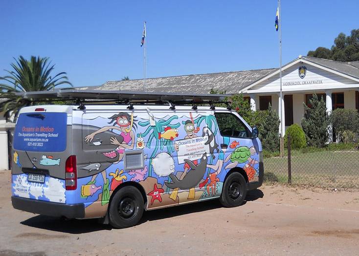 - Our Oceans in Motion outreach vehicle has solar panels on its roof to drive energy for the life support systems for the animals it transports to schools