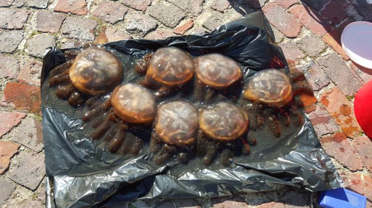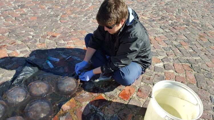 Collected individuals are numbered and corresponding genetic samples are taken from the oral arms and gonads of each individual. Thereafter, whole specimens are fixed in formaldehyde. The location of the collection is recorded, as well as the environmental parameters of the sampling location. If live specimens are needed for ecological research, they are either transported in a fibreglass aquarium on a trailer, or in buckets, with water changes every few hours.