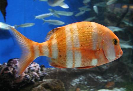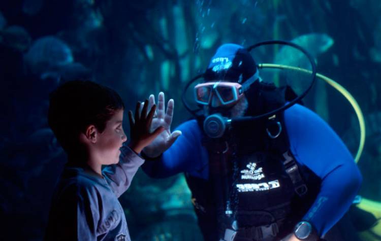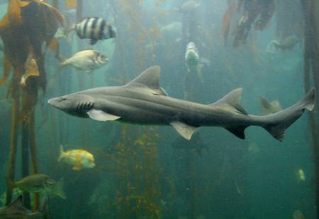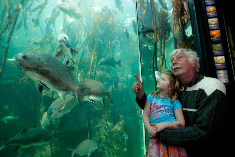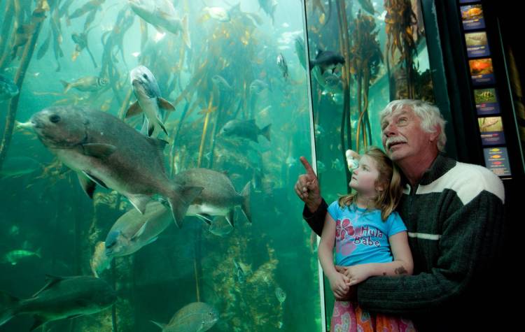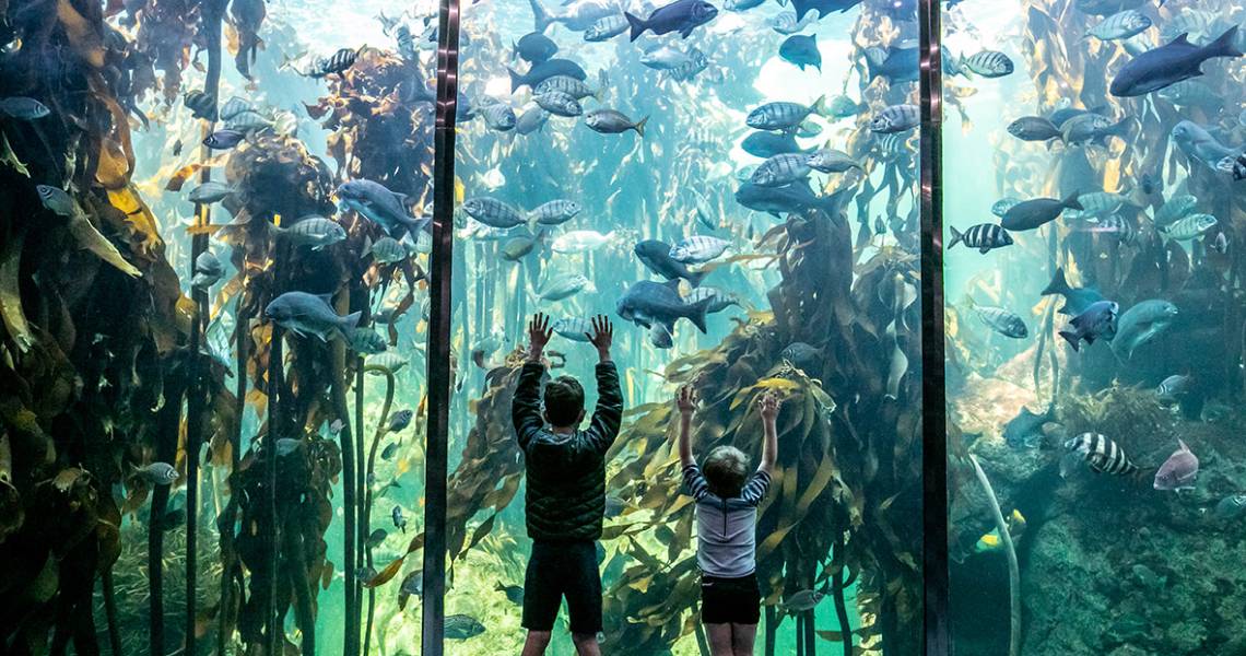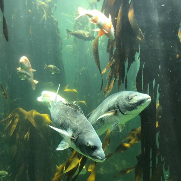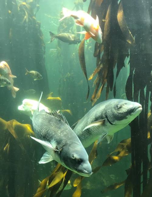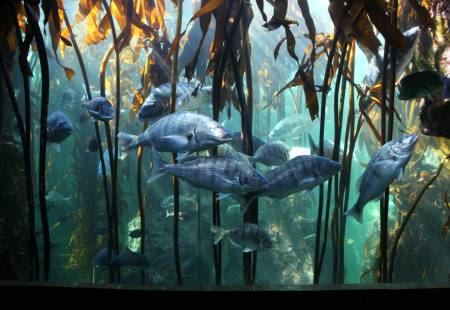 The Kelp Forest Exhibit is an underwater forest where giant sea bamboo grows like tall trees, fish swim through the algae fronds like birds and abalone, sea urchins and rock lobsters feed and take cover among the root-like holdfasts.