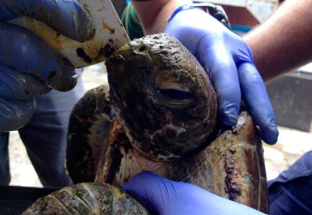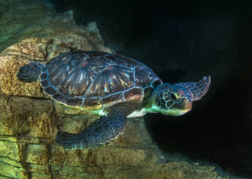 Green turtles are so named because the fat layer underneath the carapace (shell) is green! The external colour of these turtles ranges from a very dark brown to a light brown mottled colour.