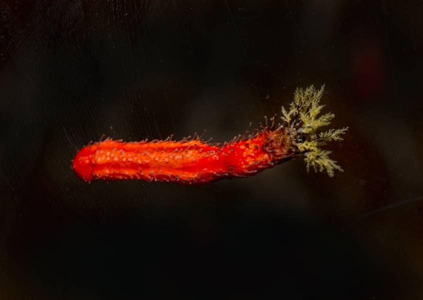Red-chested sea cucumbers live in great numbers on shallow reefs. According to Two Oceans: A Guide to the Marine Life of Southern Africa (Struik Nature, 2010), the “young are brooded in pockets in the skin and can often be seen clinging to the surface of the parent”.
